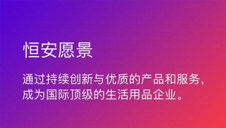 恒安坚持“诚信、拼搏、创新、奉献”的精神,以“追求健康,你我一起成长”为使命,通过持续的创新与优质产品服务,致力成为国际顶级的生活用品企业。